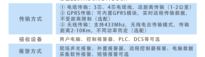 ①電纜傳輸:3芯、4芯電纜線,遠(yuǎn)距離傳輸(1-2公里)②GPRS傳輸:可內(nèi)置GPRS模塊,實時遠(yuǎn)程傳輸數(shù)據(jù),不受距離限制(選配)③無線傳輸:支持433Mhz,無線電臺傳輸模式,傳輸距離2-10Km,不同功率而定(選配) |