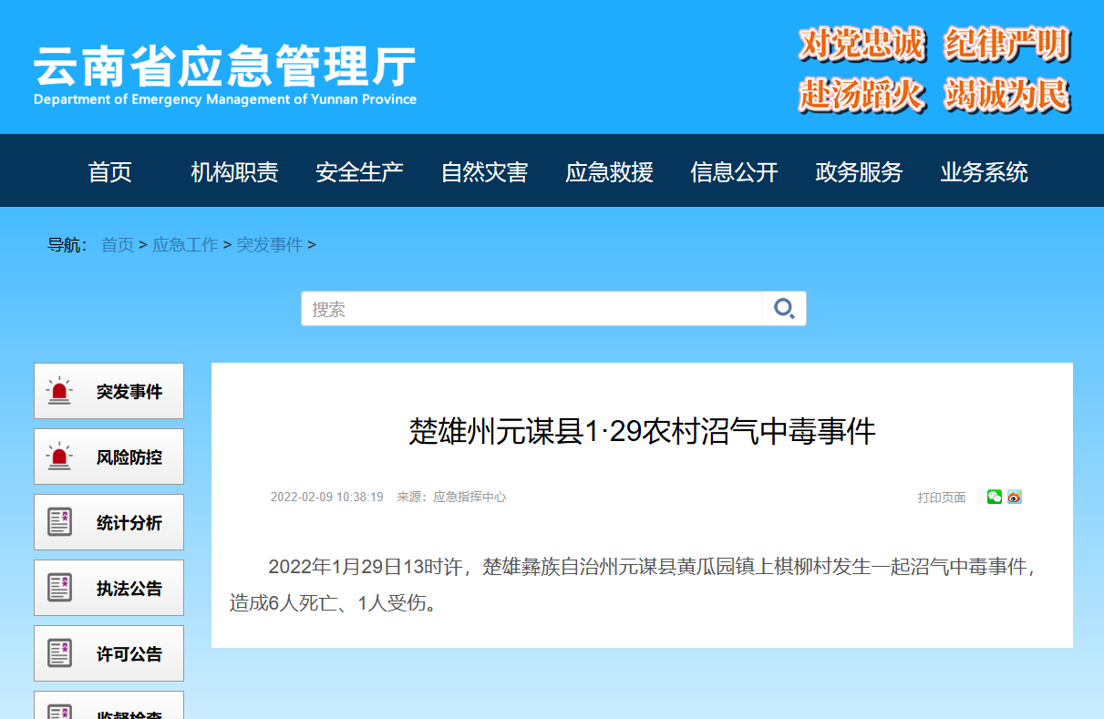2月9日,云南省應(yīng)急管理廳通報了“楚雄州元謀縣1·29農(nóng)村沼氣中毒事件”。
