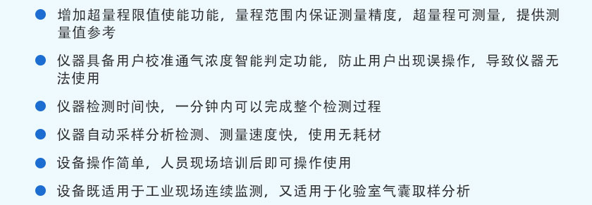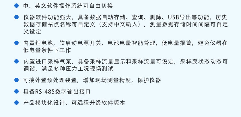 SO2、NO、NO2:0~100mg/m3;O2:0~25%;CO:0~100mg/m3;CO2:0~50%;(量程可以根據用戶實際需求配置) |