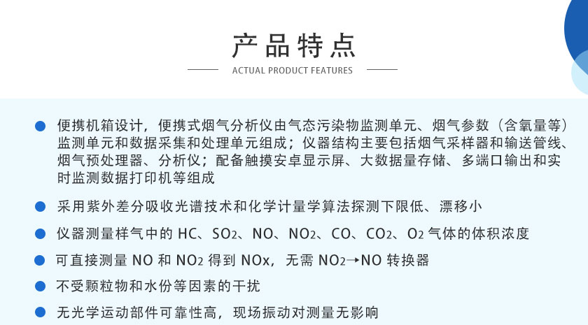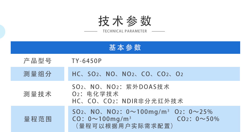 SO2、NO、NO2:紫外DOAS技術;O2:電化學技術;HC、CO、CO2:NDIR非分光紅外技術 |